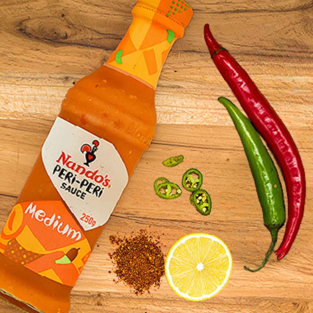 Nando’s Medium Peri-Peri Sauce 250g is the perfect balance of gentle heat and bold, zesty flavour, crafted with African Bird’s Eye Chilli, garlic, lemon, and a signature blend of spices.